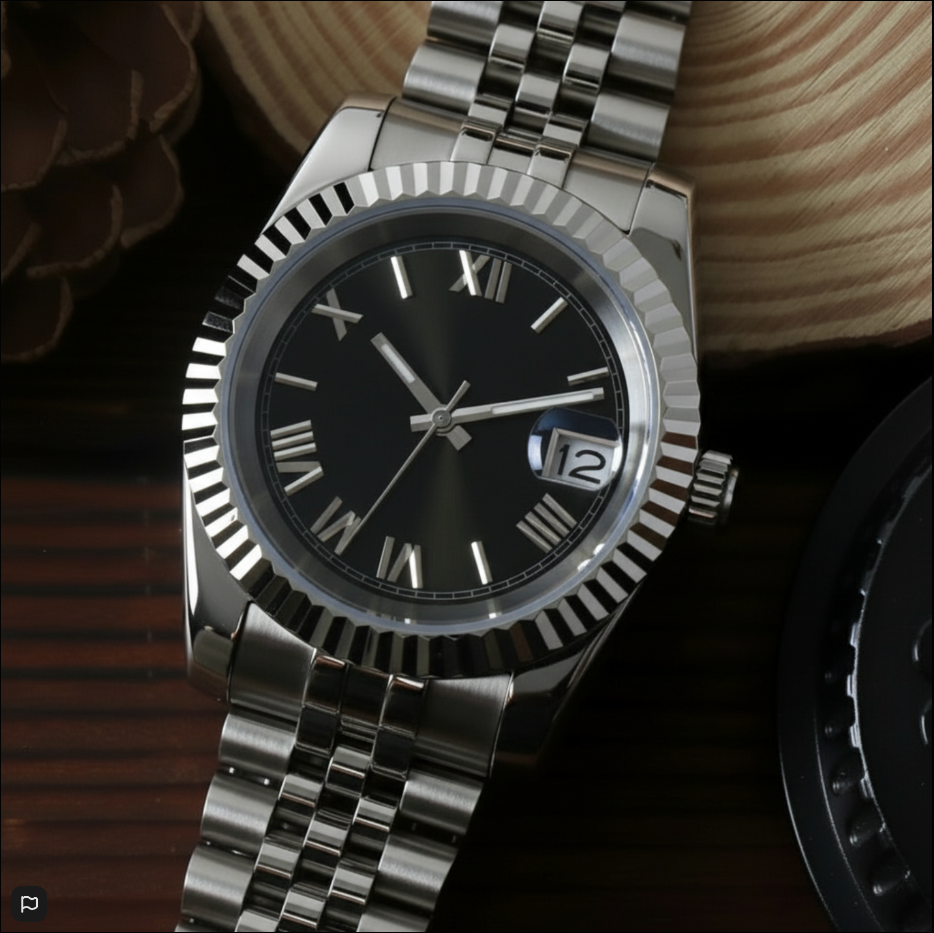 The Seikmod Black Roman Dial Lux Edition is a minimalist statement of elegance and craftsmanship. Featuring a refined sunburst black dial with classic Roman numerals, this piece embodies timeless design with a modern mechanical soul. Its full 316L stainless steel construction, fluted bezel, and polished Jubilee bracelet make it a versatile companion for any occasion — from formal wear to everyday sophistication.
